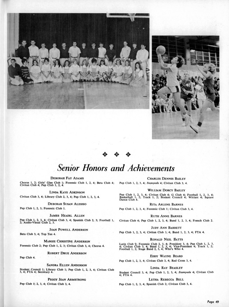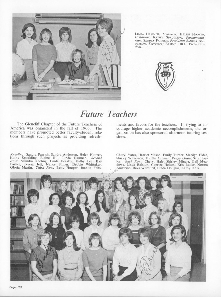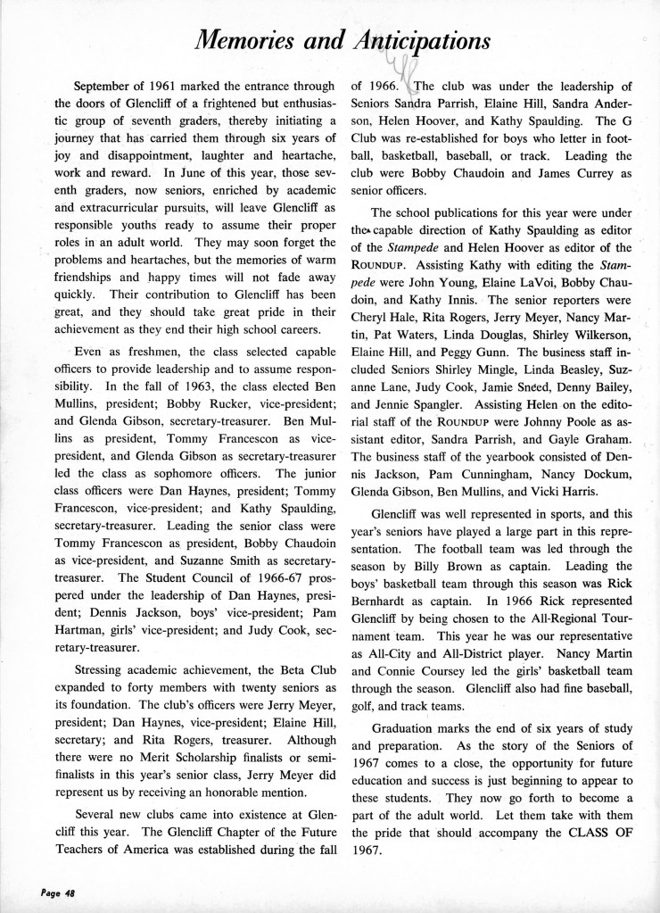 Glencliff High School for the first time in 1957 opened its doors to receive 350 seventh and eighth graders and 13 faculty members. Five years later, the spring of 1962, the first senior class composed of 125 members was graduated. Glencliff is now in its 8th year, with a student body of 1,763 students and 65 faculty members. These have been seven years of progress, growth and development. But only the roots of Glencliff lie buried in the past; the future will witness perennially blossoming truth, knowledge, and wisdom.