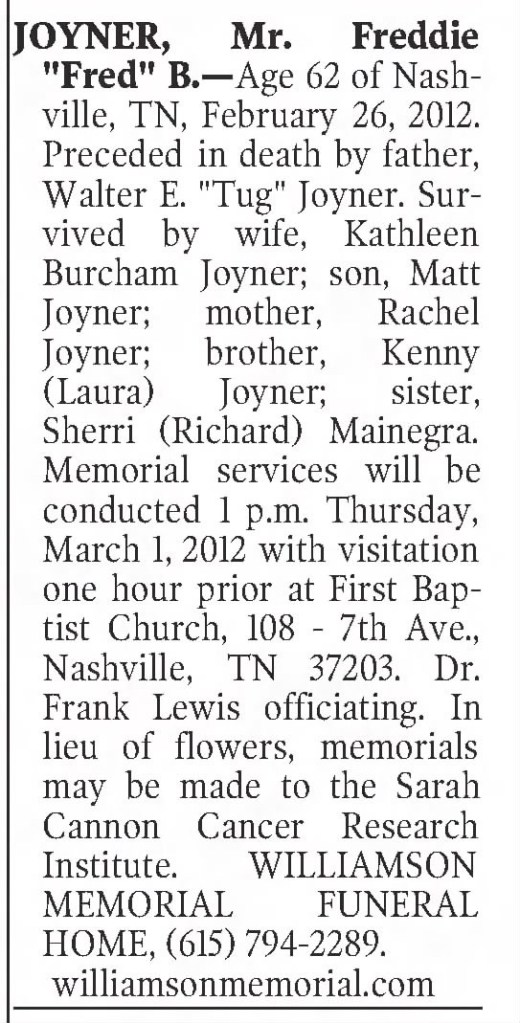 Fred ‘Freddie’ Bryan Joyner (1949 – 2012) Williamson Memorial Cemetery, FranklinWilliamson Memorial Cemetery, Franklin