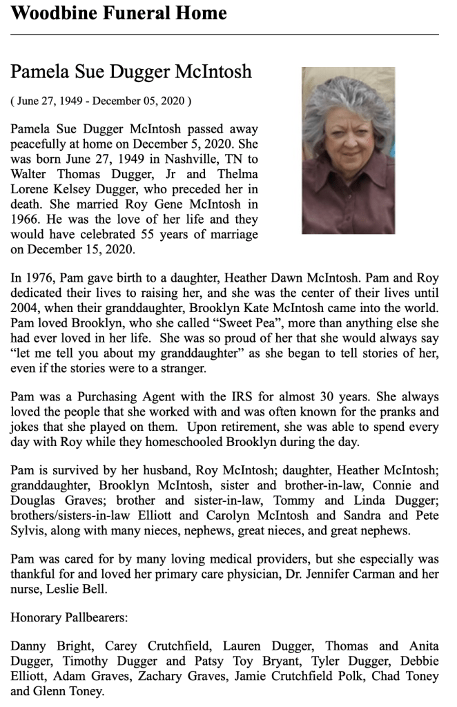 Pamela ‘Pam’ Sue Dugger McIntosh (1949 – 2020)
