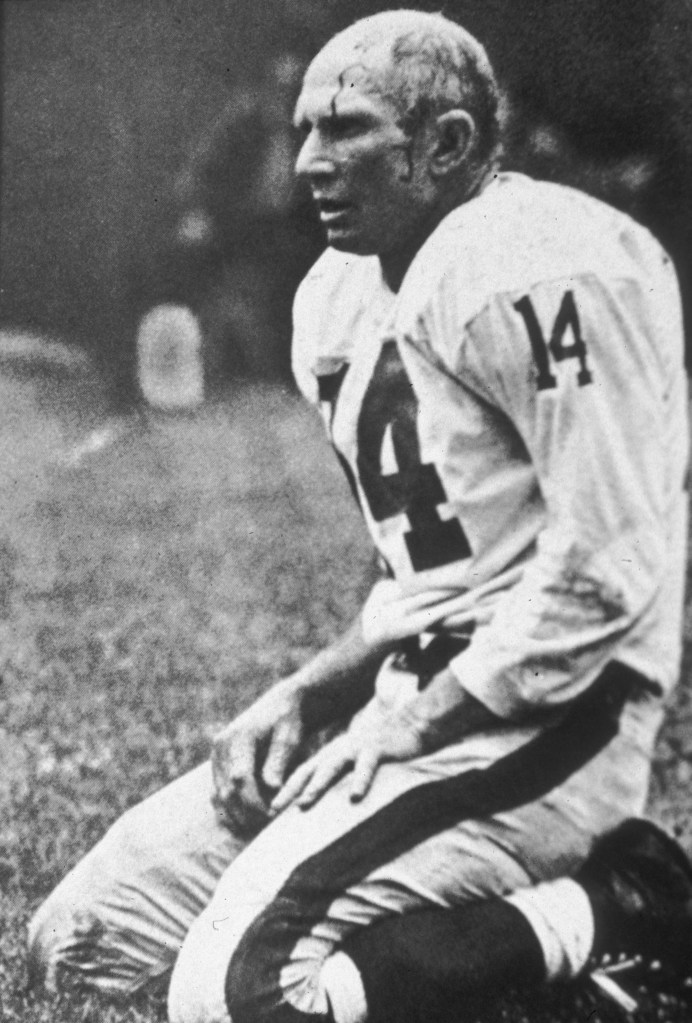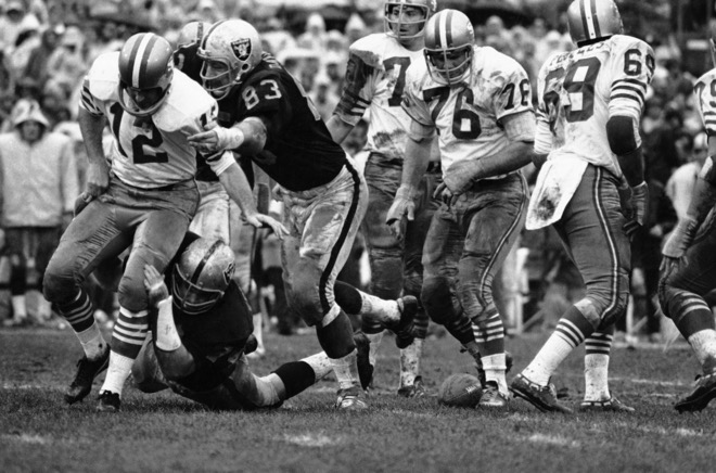 Big Ben Davidson (83) and Tom Keating (on ground) of the Oakland Raiders got to San Francisco 49er quarterback John Brodie on what appeared to be a busted play on Dec. 20, 1970 in game played on muddy field in Oakland but the play was called back and San Francisco penalized for illegal procedure. The Forty Niner line set a record for the season today when they did not allow the defense to get to the quarterback a single time. Forty Niners also won the game 38-7 and the division championship, their first ever in the NFL. (AP Photo) ORG XMIT: APHS205918