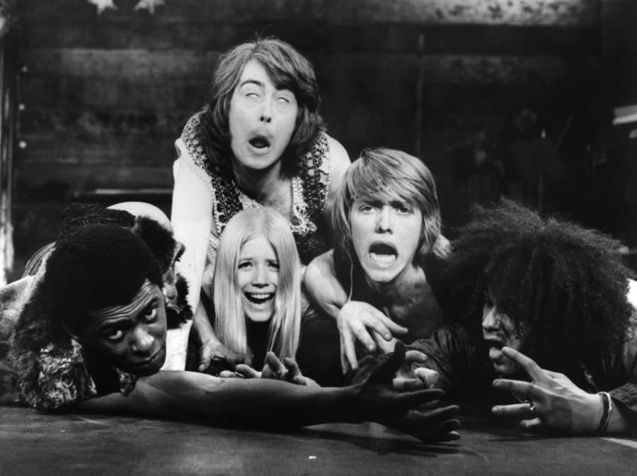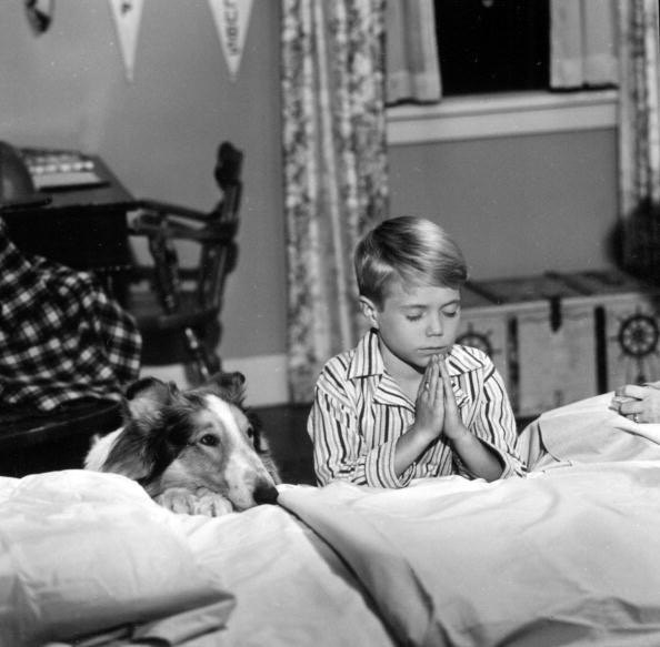 American animal actor Spook, as Lassie, sits next to child actor Jon Provost, as Timmy, who prays in an episode of the television show ‘Lassie’ entitled ‘Cully’s New Pet,’ July 12, 1960. The episode originally aired September 25, 1960. (Photo by CBS Photo Archive/Getty Images)